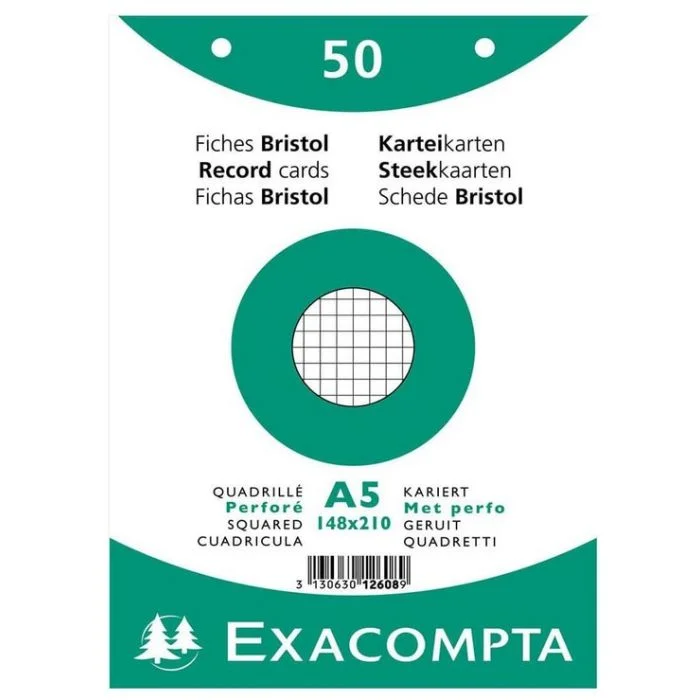 Fiches bristol quadrillées perforées 148 x 210 mm Blanches Exacompta pour mémos et notes de qualité. N° Réf. 12608E