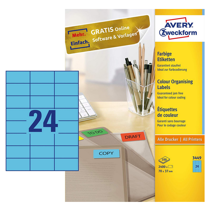 Étiquettes adhésives Bleues 70 x 37 mm pour un marquage de qualité AVERY. N° Réf. 3449