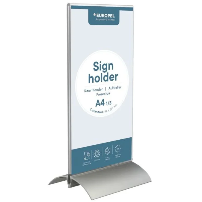 Présentoir 1/3 A4 pour table ou comptoir avec un socle en aluminium qui permet d'afficher vos prix, promotions, menus, etc. N° Réf. 350060
