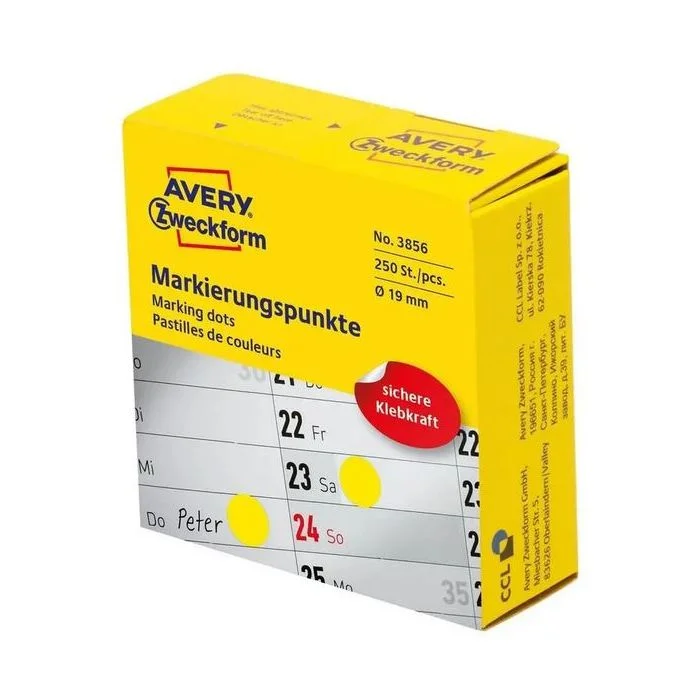 Boite distributrice d'étiquettes autocollantes rondes 19 mm jaunes d'Avery, gommette de marquage et de signalisation de produit. N° Réf. 3856