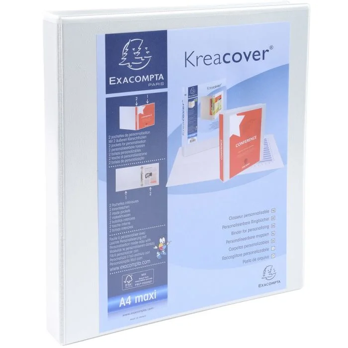 Classeur Blanc personnalisable dos de 38 mm avec 2 pochettes extérieures et 2 anneaux EXACOMPTA. N° Réf. 54940E