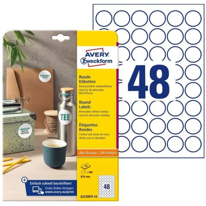 Étiquettes rondes de 30 mm autocollantes enlevables AVERY pour un marquage et étiquetage plus sûre et flexible. N° Réf. 6223REV-10