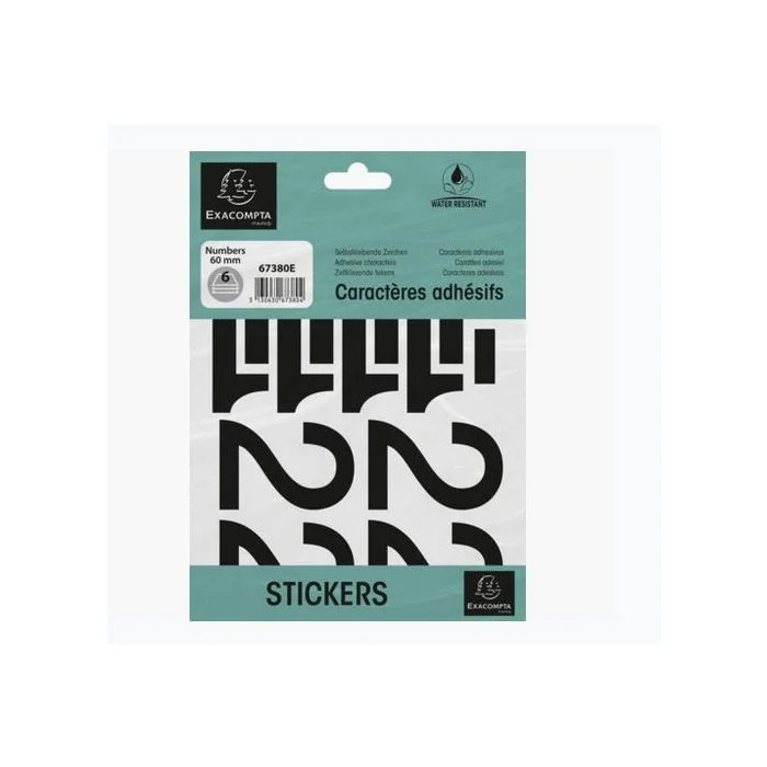 Chiffres adhésifs de 0 à 9, hauteur 60 mm, idéal pour personnaliser vos vitrines, boîtes aux lettres, portes, fenêtres, etc EXACOMPTA. N° Réf. 67380E