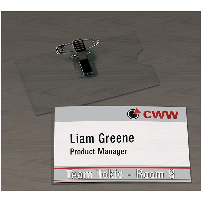 Badge en plastique transparent PAVO avec clip ou épingle pour salon, congrès, centre de formation, visiteurs, etc. N° Réf. 8046850