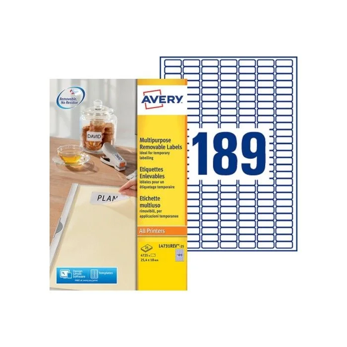 Planche de petites étiquettes adhésives repositionnables 25,4 x 10 mm d'AVERY pour marquer et identifier les objets et produits. Grand paquet. N° Réf. L4731REV-25