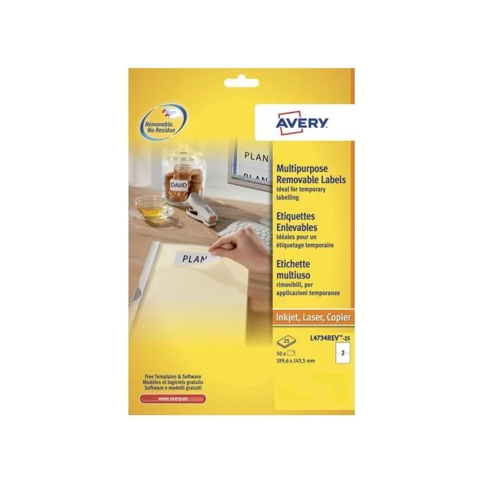 Planche d'étiquettes adhésives 199,6 x 143,5 mm repositionnables écologiques d'AVERY pour marquer, étiqueter et identifier les objets et produits. N° Réf. L4734REV-25 E