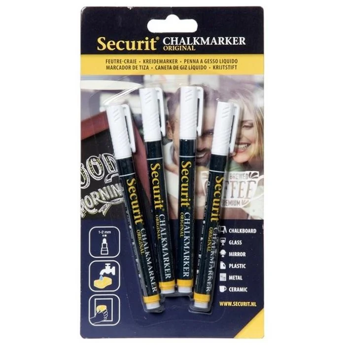 Marqueur blanc à craie liquide (tracé 1-2 mm) pour tableau ou ardoise SECURIT Lot de 4. N° Réf. BL-SMA100-V4-WH