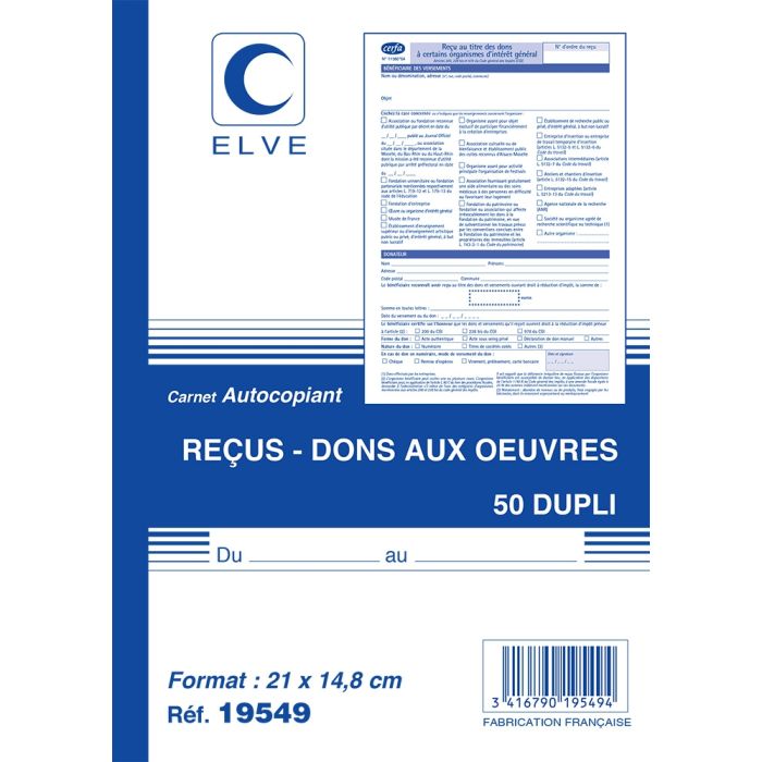 Carnet Reçus Association - Dons aux œuvres Cerfa ELVE