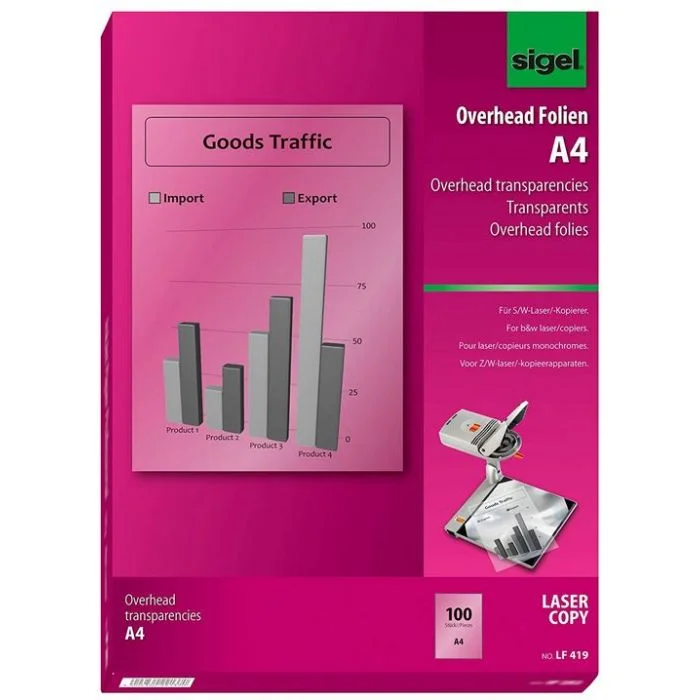 Film transparent A4 pour réaliser des diapositives, des reportings, des Présentations au rétroprojecteur de Sigel. N° Réf. LF419