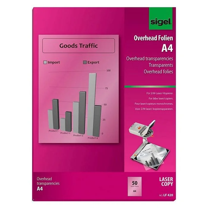 Film transparent A4 de 0,10 mm pour réaliser des diapositives, reportings, présentations au rétroprojecteur de SIGEL. N° Réf. LF420